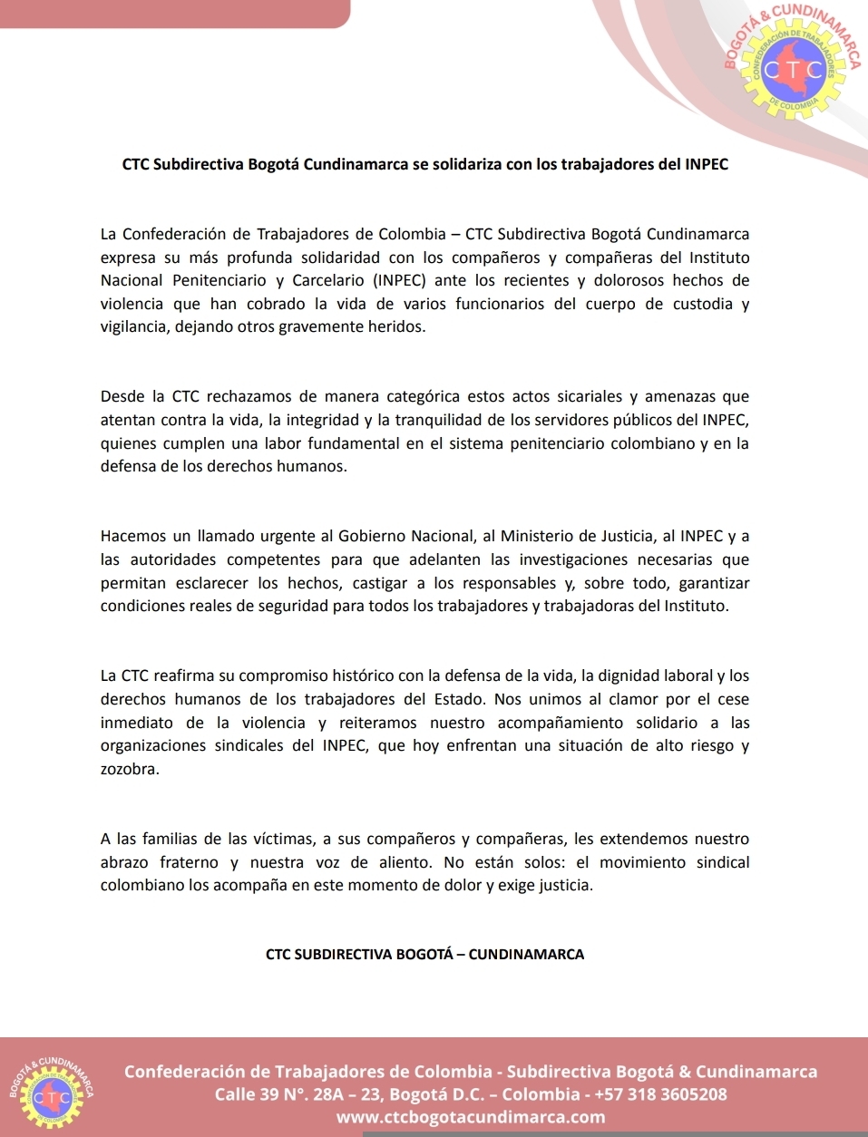 COMUNICADO DE LA CTC SUBDIRECTIVA BOGOTÁ – CUNDINAMARCA